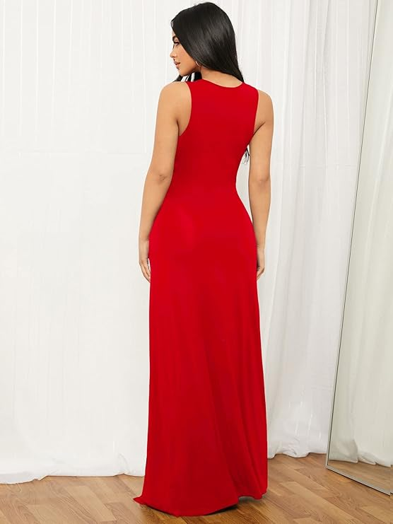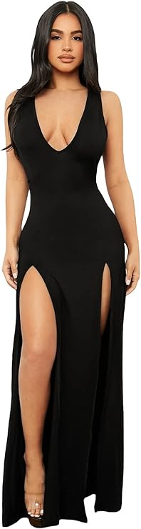 Features: maxi dress, solid color, plunging deep v neck, high split on both sides, sleeveless, bodycon dress, sexy and slinky